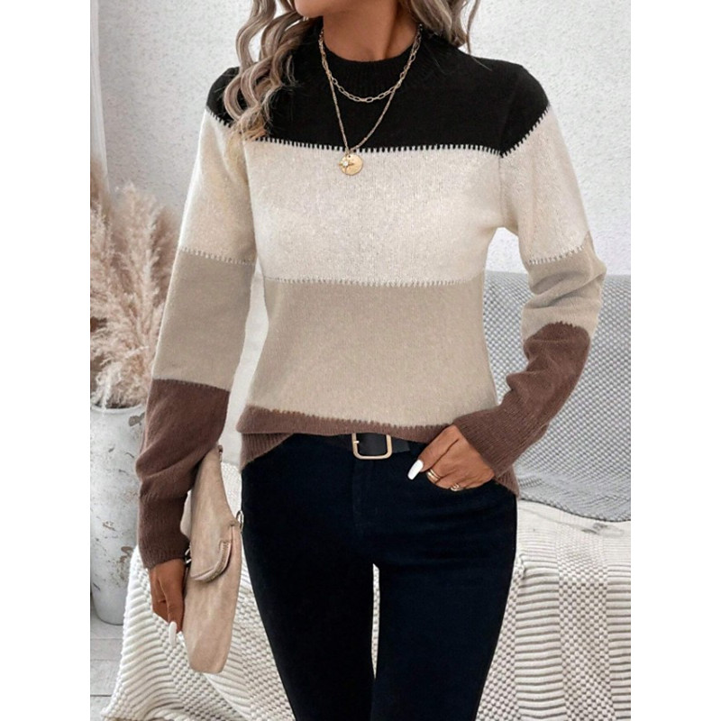 Women's Sweater Casual Soft Striped Ribbed Crew Neck Patchwork Knitted Long Sleeve Regular Tops Knit Outdoor Daily Weekend Pink Camel Fall Winter
