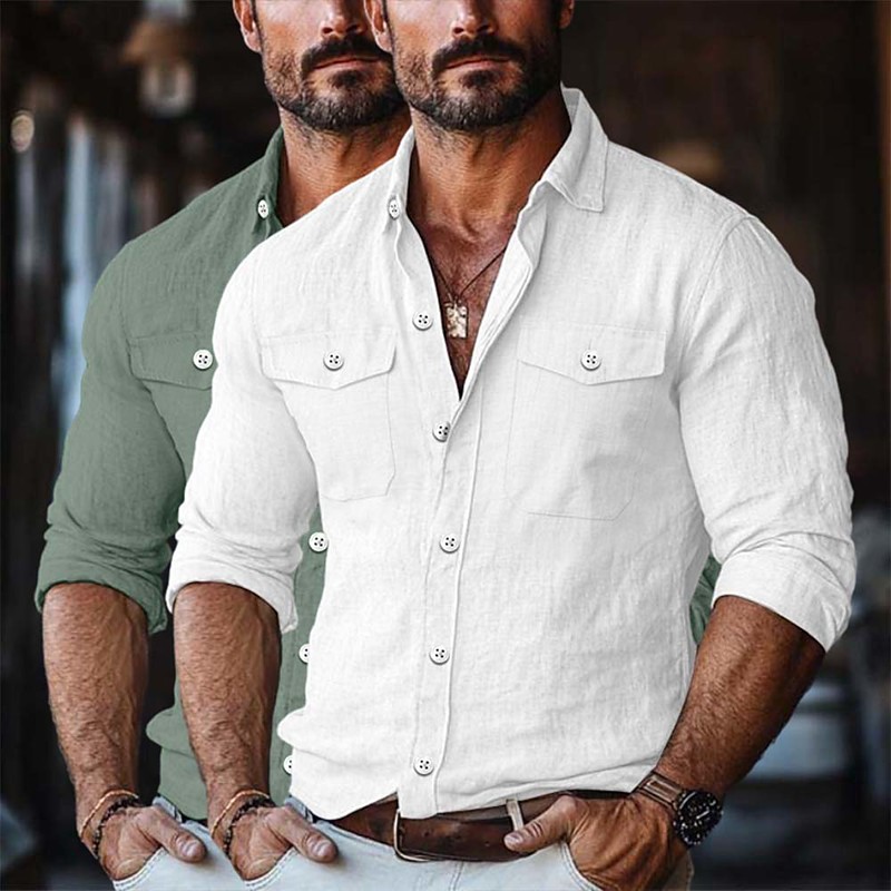 Men's Shirt Linen Shirt Summer Shirt Button Up Shirt Cargo Shirt Solid Color Vacation Street WhiteGreen WhiteKhaki GreenKhaki BlueKhaki Long Sleeve Turndown Clothing Apparel Pocket