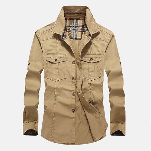 Men's Shirt Workwear Shirts Casual Shirt Work Shirt Button Up Shirt Cargo Shirt Black khaki Army Green Beige Gray Long Sleeve Plain Lapel Vacation Hawaiian Front Pocket Clothing Apparel 100% Cotton