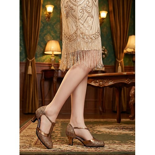 scarpe flapper da donna anni '20 Gatsby - eleganti glitter bordeaux décolleté Mary Jane metallizzate oro con tacco a gattino vintage cinturino a T per ballo da sala, feste a tema matrimoni