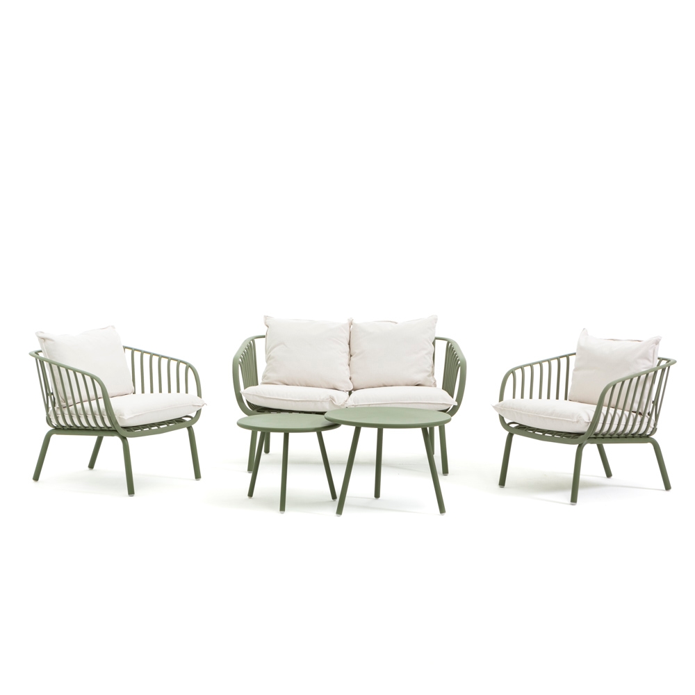 RATTATAN Gartenset aus Harz und Stahl mit 10 cm dicken cremefarbenen Kissen, elegantes Outdoor-Lounge-Set in Salbeigrün für Terrasse, Veranda, Garten –Bellagio