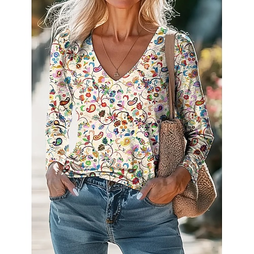 Per donna Blusa Floreale Bohemien Quotidiano Manica Lunga Scollo a V Top Regolari Quotidiano Ferie Stampato Nero Bianco Viola Verde Albicocca Estate Primavera Autunno