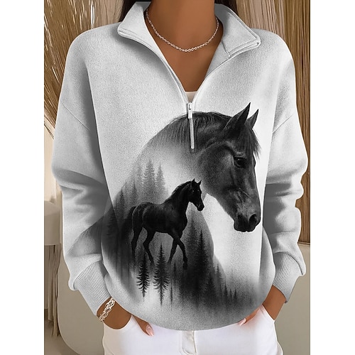 Per donna Felpa Pullover Grafico Animale Casual Manica Lunga Mezza zip Top Regolari Abbigliamento Quotidiano Casuale Ferie Cerniera Bianco e nero Nero Bianco Grigio Autunno