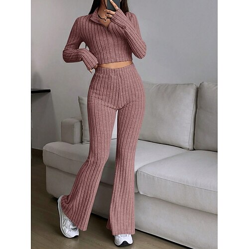 Per donna Moda Streetwear Set di Pantaloni Bolero Top Manica Lunga Colletto a Camicia Tinta unica Cerniera All'aperto Lavoro Casuale Nero Vino Cammello Primavera Taglia piccola