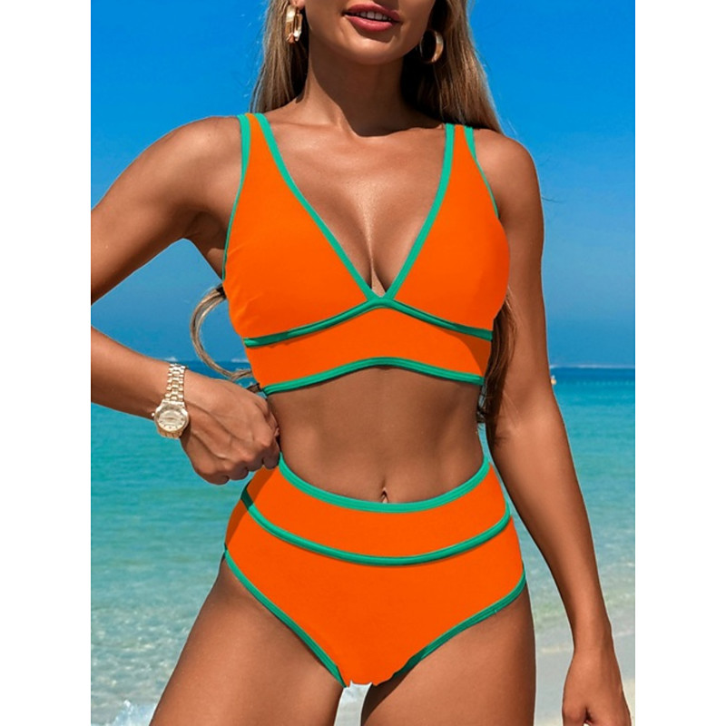 Women's Bikini 2 Piece Swimsuit Colorblock Cheeky Tummy Control High Waist Slim Backless Vacation Beach Wear Stripe V Neck Sleeveless Bathing Suits