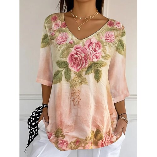 Per donna Blusa Floreale Grafico Vintage Tropicale Elegante Manica 3/4 Scollo a V Top Regolari Quotidiano Rosa Rosa polverosa Viola Estate Primavera Autunno