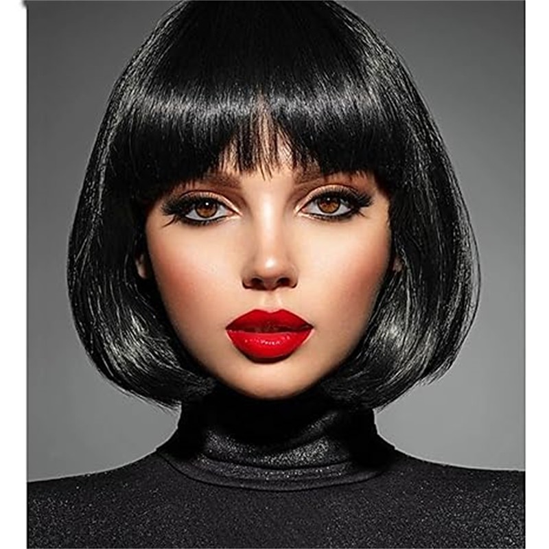 Short Bob Hair Wigs 12 Straight with Flat Bangs Synthetic Colorful Cosplay Daily Party Wig for Women Natural As Real Hair