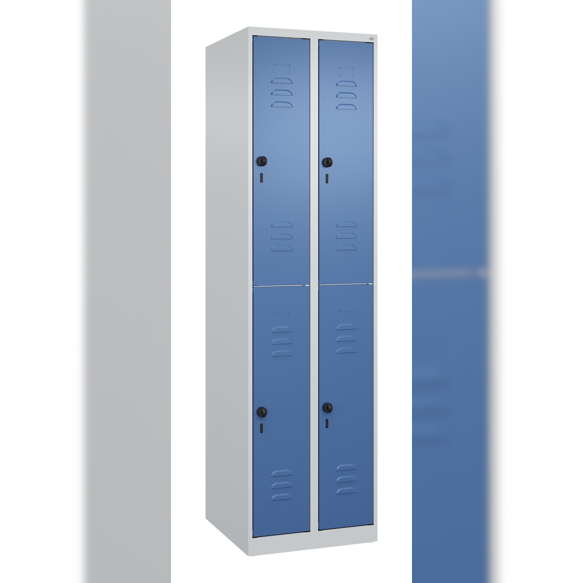 C+P Aufbewahrungs Doppel-Spind Classic PLUS, Sockel, 2 Abteile, 4 Fachböden, HxBxT 195x60x50cm, Zylinderschloss, Hellgrau/Enzianblau von PROREGAL
