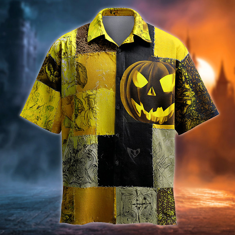 Halloween Men's Color Block Pumpkin Patchwork Shirt Summer Shirt Button Up Shirt Short Sleeve Dark Gothic Style Holiday Streetwear Summer Spring Turndown 3D Print Collared Shirts Yellow Orange Green