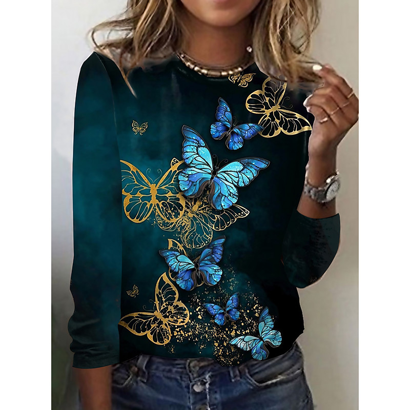 Women's T shirt Crew Neck Long Sleeve Tunic Vintage Basic Butterfly Print Regular Tops Round Neck Daily Weekend Pink Blue Purple Brown Green Fall Winter