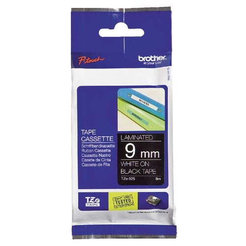 Brother TZe-325 Authentic Schriftband Selbstklebend Weißer Druck auf Schwarz 9 mm x 8m