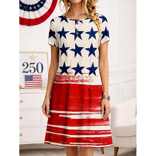 Abito MIDI Donna Patriottico Americana Festa dell'Indipendenza Abito Shift Maglietta Abito Casual Formale Esterno Festa Fit Standard Floreale Astratto Stelle e Strisce Maniche Corte