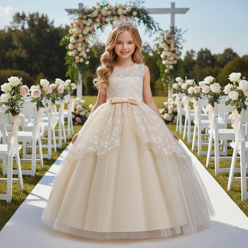 Flower Girl Dress Girls' Formal Dress Wedding Attire Party Wedding Formal Fashion Adorable Formal Patchwork Mesh Floral Princess Sleeveless Crew Neck Blue Champagne 4 years