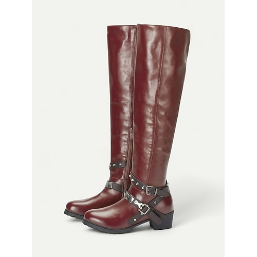 stivali da donna con tacco alto fino al ginocchio, dettaglio fibbia e calda fodera in peluche - eleganti calzature invernali per abbigliamento casual e formale