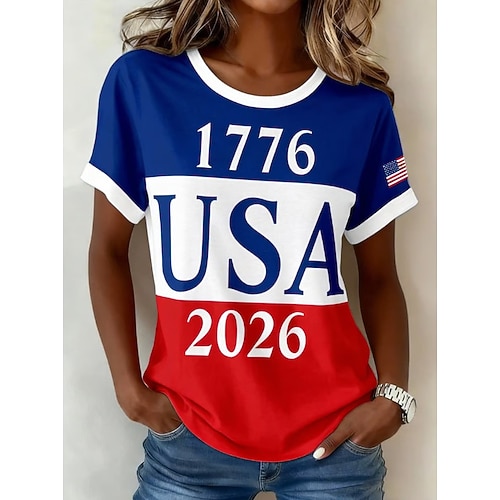 T Shirt patriottica delle donne americane per il 250° anniversario Stampa a Blocchi di Colore Grafica Lettera Bandiera Americana Elegante Classica Casual Maniche Corte Collo A Giro Top Regolari