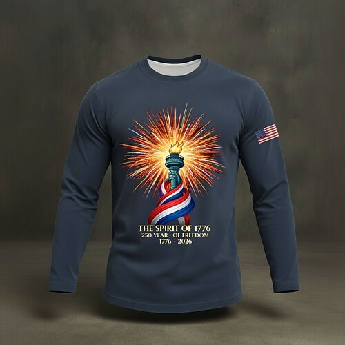 Amerikas 250. Jahrestag Herren Grafik Flagge Fackel T Shirt T-Shirt Langarmshirt Langarm T-Shirt 3D-Druck Rundhalsausschnitt Hemd Mode Täglich Basic Täglich Urlaub Straße Marineblau Khaki Armeegrün