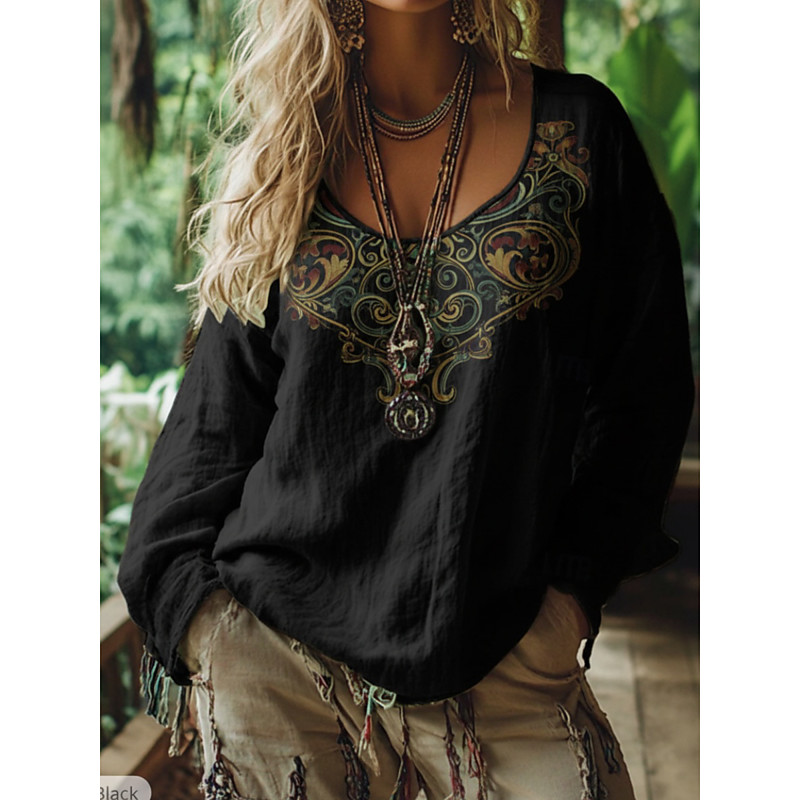 Women's Boho T-shirt T Shirt Tee Top Floral Vintage Ethnic Casual Long Sleeve V Neck Regular Tops Daily Weekend Vacation Wear Print Black Pink Spring Fall