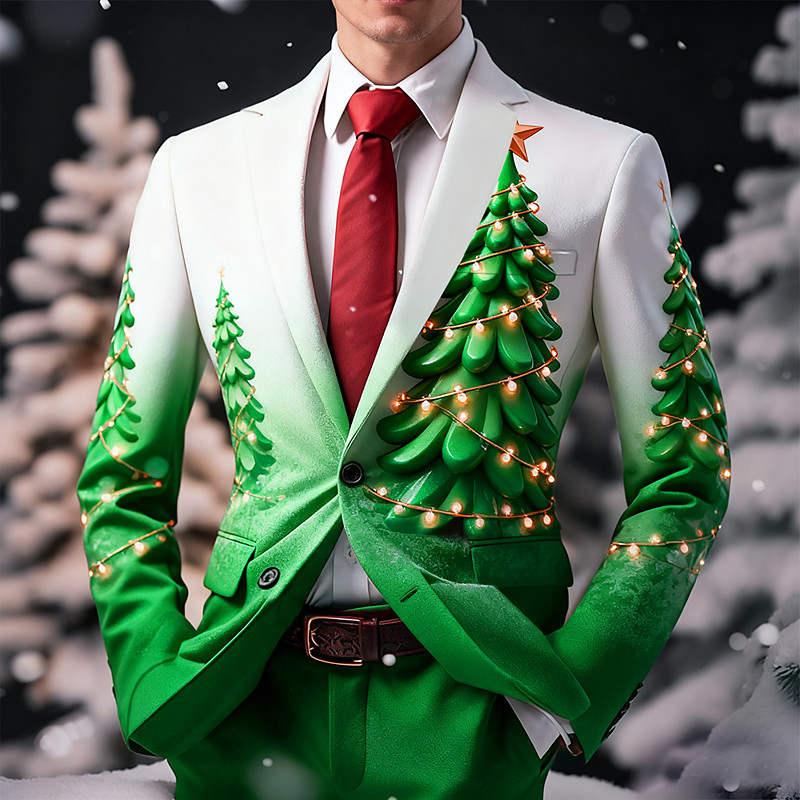 Men's Blazer Coat Christmas Casual Casual Daily Fall / Winter 100% Polyester Christmas Tree 3D Print Buttons Thermal Warm Comfortable Single Breasted Blazer Red Blue Purple Green