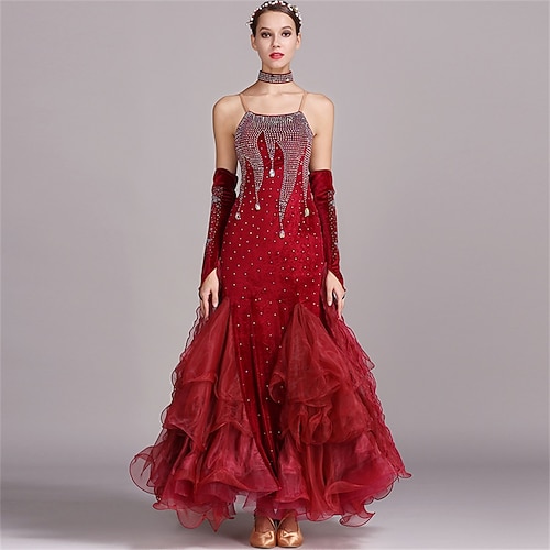 Abito da ballo da sala rosso elegante da donna con strass decorato, abito da competizione per valzer, tango, rumba moderna