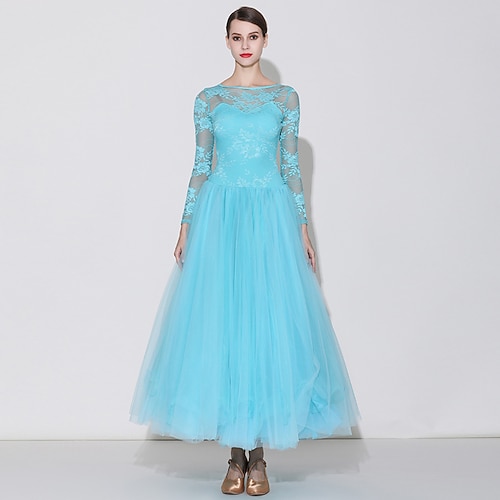 Abito da ballo da sala da donna elegante turchese in pizzo con maniche lunghe e scollo a barca, per prove di valzer, tango, rumba moderna