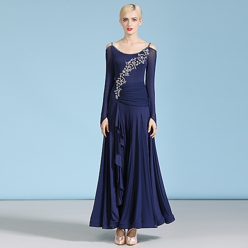 abito da ballo da sala da donna blu navy, con ricami in strass, abito da valzer con spalle scoperte, vita arricciata, abito da competizione moderno standard