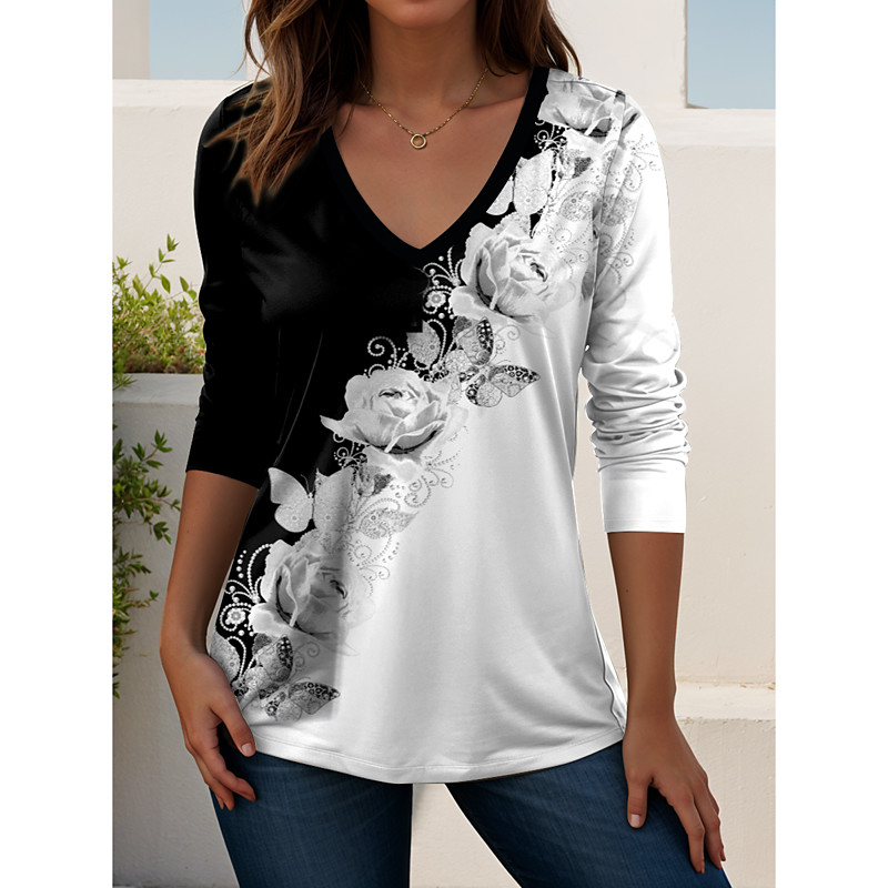 Women's T shirt Long Sleeve V Neck Long Sleeve Tunic Floral Graphic Plants Vintage Stylish Classic Regular Tops Daily Going out Weekend Print Black and White Black Blue Brown Spring Fall Prefall