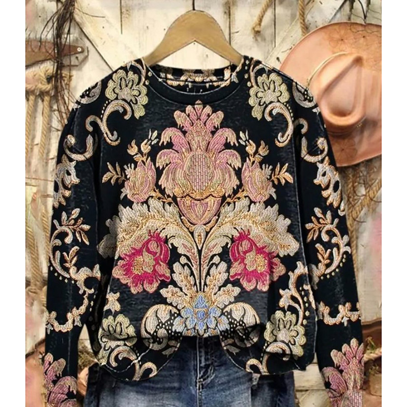 Women's Pullover Sweatshirt Floral Graphic Geometric Warm Fashion Western Long Sleeve Crew Neck Regular Tops Casual Street Dailywear Print Blue Black Fuchsia Orange Green Spring Fall Winter