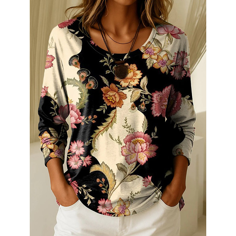 Women's T Shirt Graphic Geometric Plants Vintage Stylish Casual Long Sleeve Crew Neck Regular Tops Daily Weekend Print Blue Black Wine Purple Spring Fall Winter