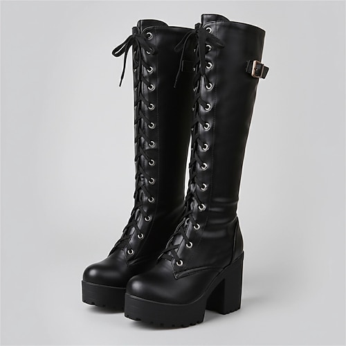 stivali alti fino al ginocchio con plateau neri da donna, lacci, tacchi spessi e dettaglio fibbia – stile gotico o punk per autunno e inverno