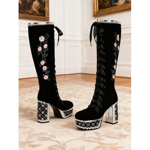 stivali alti fino al ginocchio da donna in velluto nero gotico vintage anni '20 con lacci e ricami floreali rosa, perfetti per occasioni festive, feste retrò e carnevale