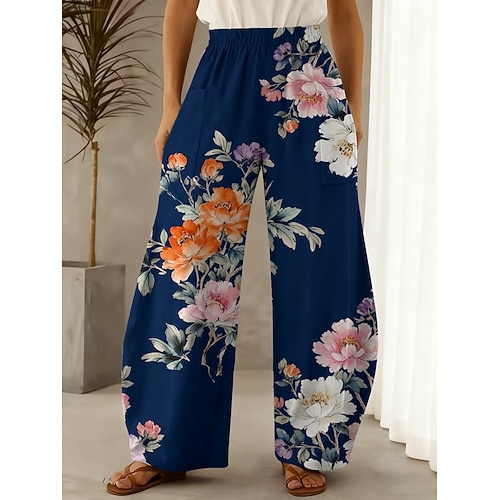 Per donna Gamba larga Pantaloni Vacanza Casual Lunghezza intera Vita Alta Floreale Coulisse Tasca Fascia Elastica Comodo Comodità Traspirabilità Inelastico Vacanza Casuale Quotidiano Blu scuro