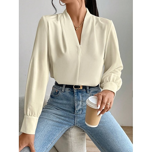 Per donna Blusa Tinta unica Elegante Manica Lunga Scollo a V Top Regolari Quotidiano Ferie Uscire Pieghettato Nero Rosa Verde militare Cammello Estate