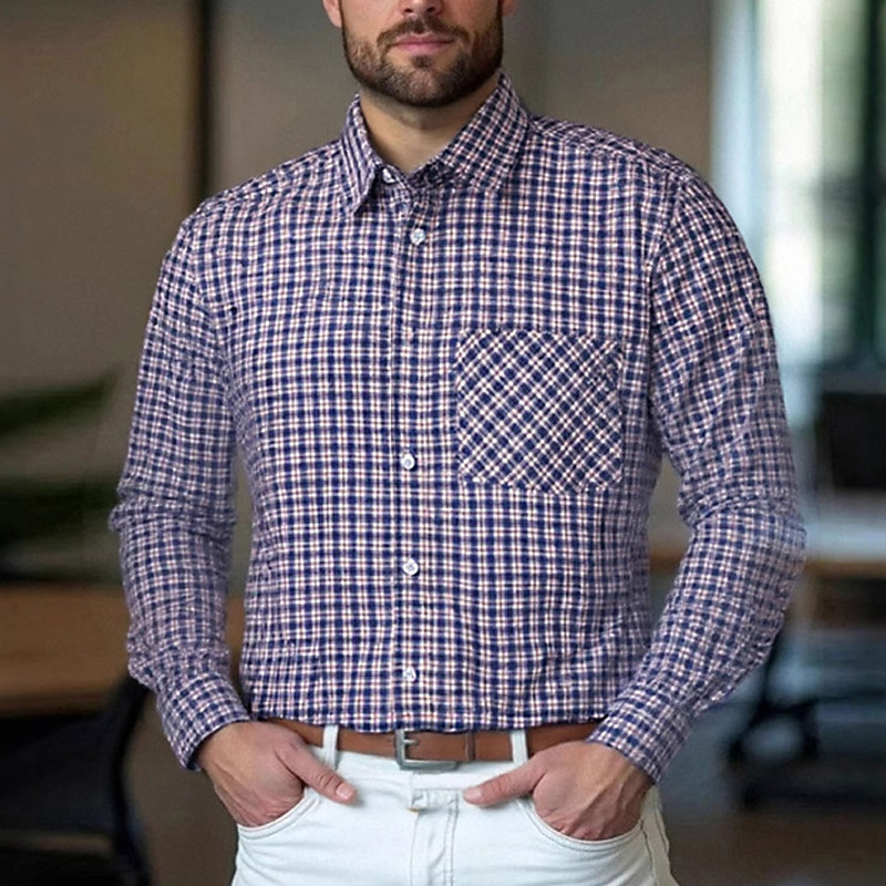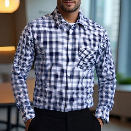 Per uomo Camicia Camicia elegante Camicia con Bottoni Plaid Matrimonio Quotidiano Blu marino Manica Lunga Collo ripiegato Primavera Autunno Abbigliamento Tasca Frontale