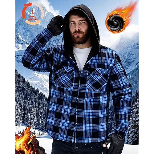 Men's Shacket Shirt Jacket Winter Jacket Plaid Vacation Daily Wear White Red Blue Orange Long Sleeve Hooded Fall Winter Clothing Apparel Front Pocket