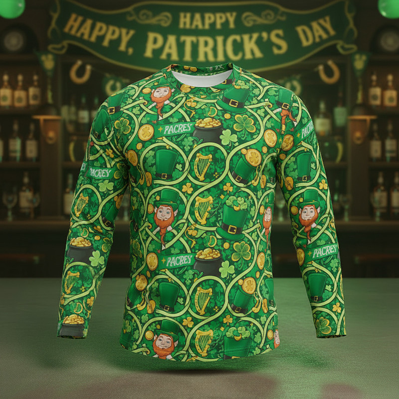 St. Patrick's Day Long Sleeve T-Shirt for Men Lucky Irish Clover Shamrock Graphic Tee 3D Print Crew Neck St. Paddy's Day Top
