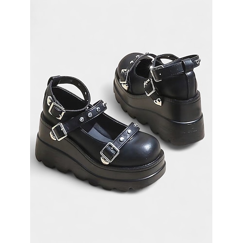 Schwarze Mary-Jane-Plateauschuhe im 80er-Jahre-Stil für Damen mit Schnallen und Herznieten – Gothic-Punk-Lolita-Stil für Halloween, Cosplay und Ausgehen