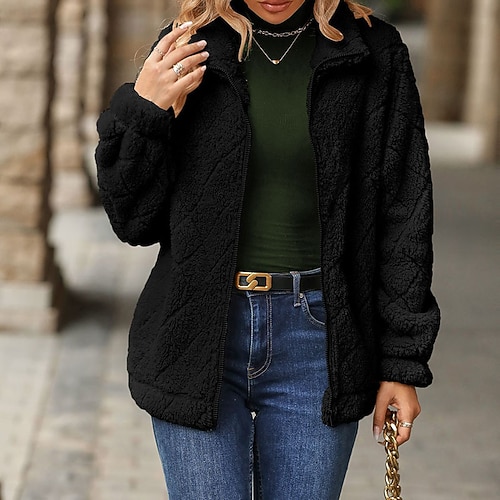 Per donna Cappotto Invernale Cappotto Teddy Caldo Confortevole Cerniera Tasca Casual Tinta unica Casuale Vacanza Streetwear Abbigliamento quotidiano Regolare Collo ripiegato Vestibilità regolare