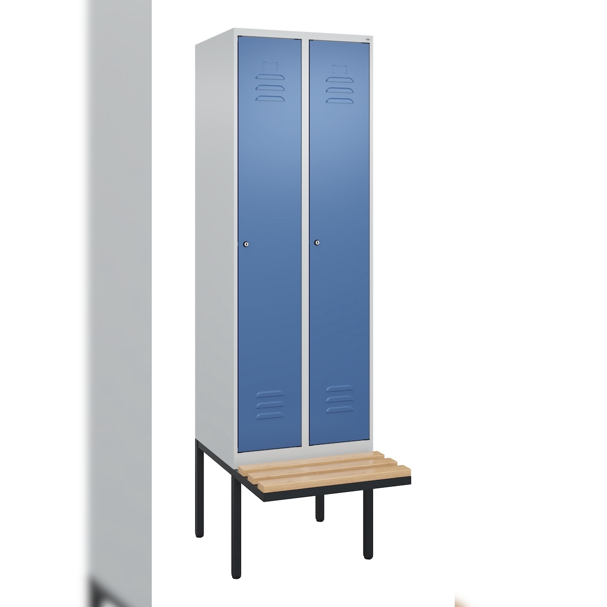 C+P Spind Classic PLUS, schwebender Sitzbank aus Buche 2 Abteile, HxBxT 212x60x82cm, Zylinderschloss, Hellgrau/Fernblau von PROREGAL