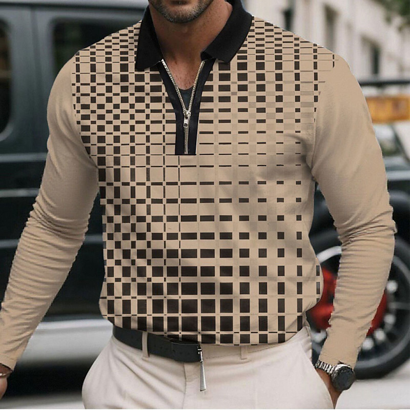 Men's Geometric Pattern Polo Long Sleeve Turndown Modern Casual Sports Outdoor Athleisure Casual Daily Zipper 3D Print Spring Fall Winter dark brown Light Brown White