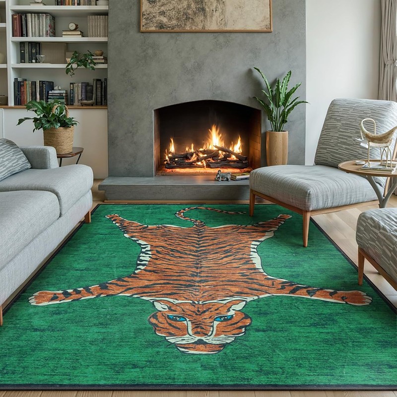 Persian Style Crystal Velvet Area Rug, Tropical Tribal Tiger Print, Living Room and Bedroom Decor, Soft and Comfortable Bedside Mat, Unique Home Accent Carpet