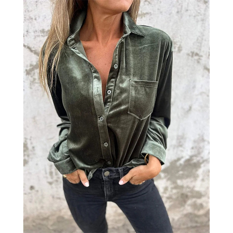 Women's Shirt Velvet Elegant Dressy Plain Elegant Ladies Stylish Long Sleeve Shirt Collar Regular Tops Work Daily Holiday Pocket Buttons Draped Wine Army Green Purple Brown Summer Spring