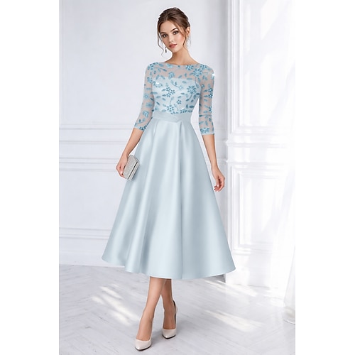 Linea ad A Lunghezza Tè Perline ricamate Abito Formale Abito da madre della sposa Abiti da Cocktail Abiti per invitati a matrimoni Elegante Pastello Manica 3/4 Scollo a Barca Formale Cocktail party