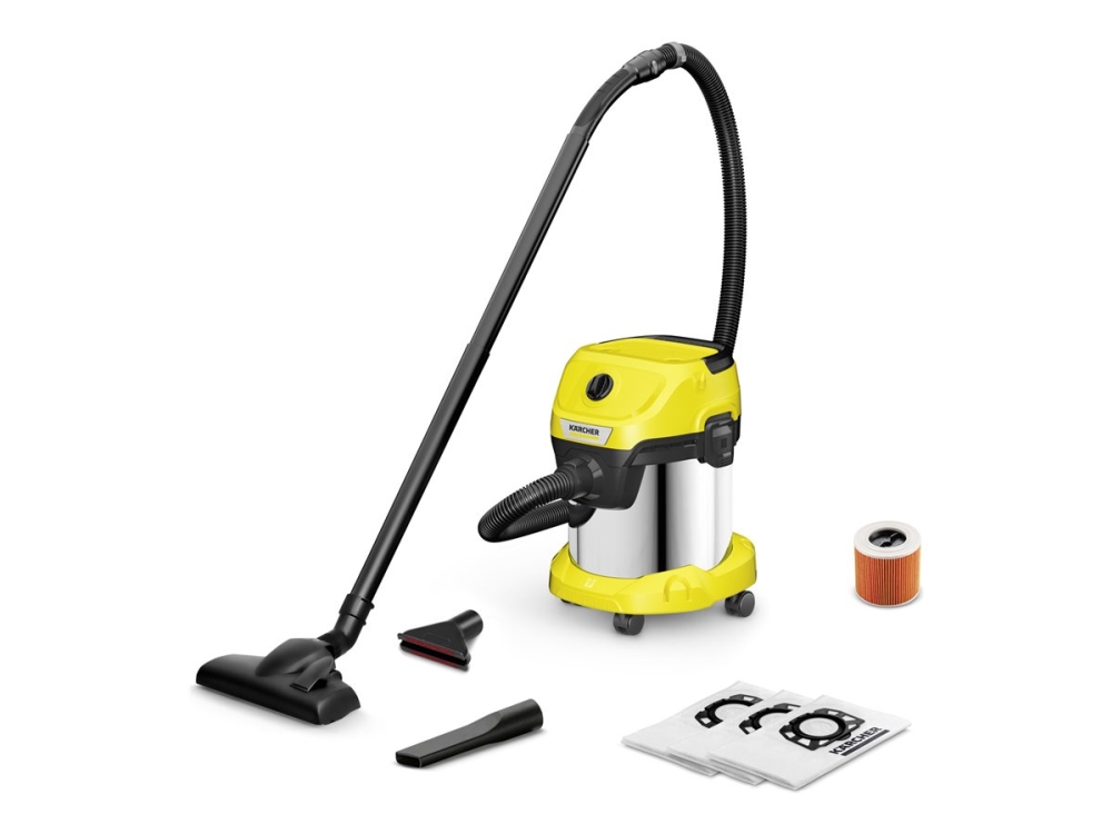 Kärcher WD 3 S, 1000 W, Tynnyri-imuri, Kuiva ja märkä, Pölypussi, 15 L, Musta, Ruostumaton teräs, Keltainen
