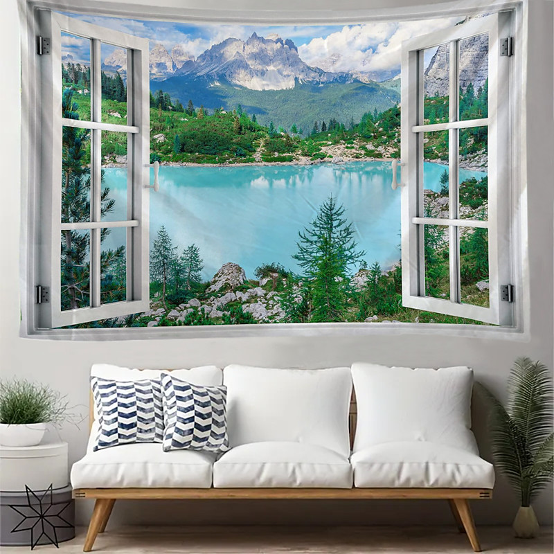 Nature Landscape Tapestry Fake Window View Mountain Lake Wall Hanging 3D Visual Effect Backdrop for Living Room Bedroom Home Decor