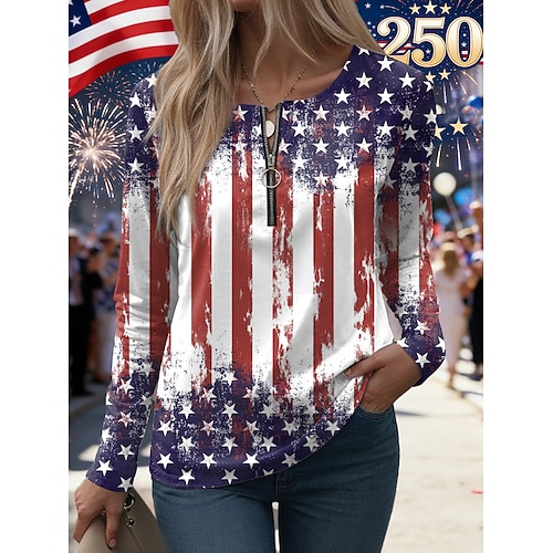 Giorno dell'Indipendenza Americana Per donna Maglietta Grafico Bandiera Americana Vintage Moda Casual Manica Lunga Girocollo Top Regolari Quotidiano Cerniera Stampato Blu Bianco Rosso Estate Primavera