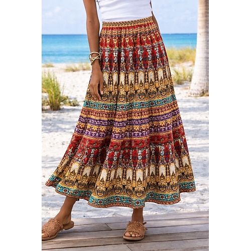 Damen Urlaubsrock Bohemien Vintage Maxi Hohe Taille Röcke Blumen Grafik Tasche Druck Unelastisch Täglich Urlaub Rosa Rote Sommer 95 % Polyester, 5 % Elastan