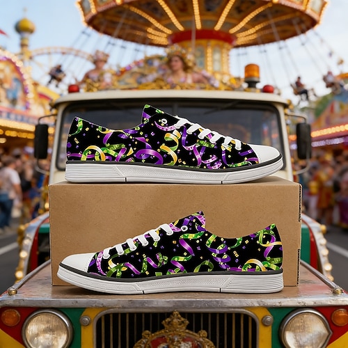 Damen-Sneaker aus Canvas mit Mardi-Gras-Konfetti-Print und Schnürung – stylische und bequeme Freizeitschuhe für Karnevalsumzüge, Ausflüge in den Vergnügungspark, Straßenfeste und sommerliche Alltagsbeschäftigungen