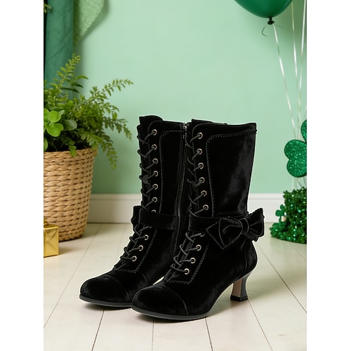 stivali stringati in velluto verde bosco da donna: eleganti stivaletti con tacco a gattino e fiocco per eventi di San Patrizio e festival invernali