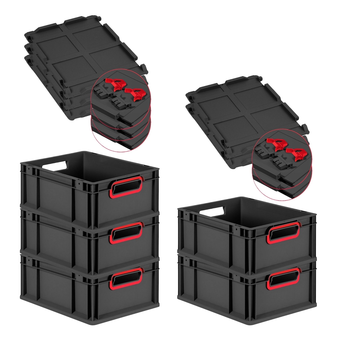 PROREGAL SuperSparSet 5x Eurobox NextGen Color mit Scharnierdeckel & Verschlüssen, HxBxT 17x30x40cm, 16L, Schwarz, Griffe rot offen, Eurobehälter