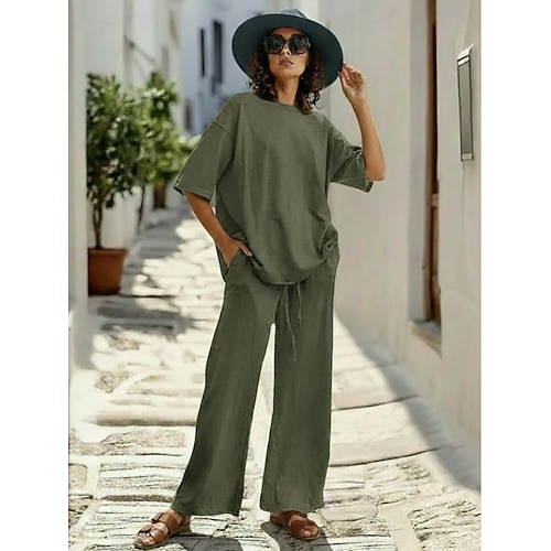 Completo pantaloni da donna in lino al 15%, completo in lino, tinta unita, tasca, elastico in vita, t-shirt, pantalone, casual, a maniche lunghe, girocollo, blu, nero, bianco, blu navy, marrone chiaro, estate, primavera